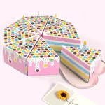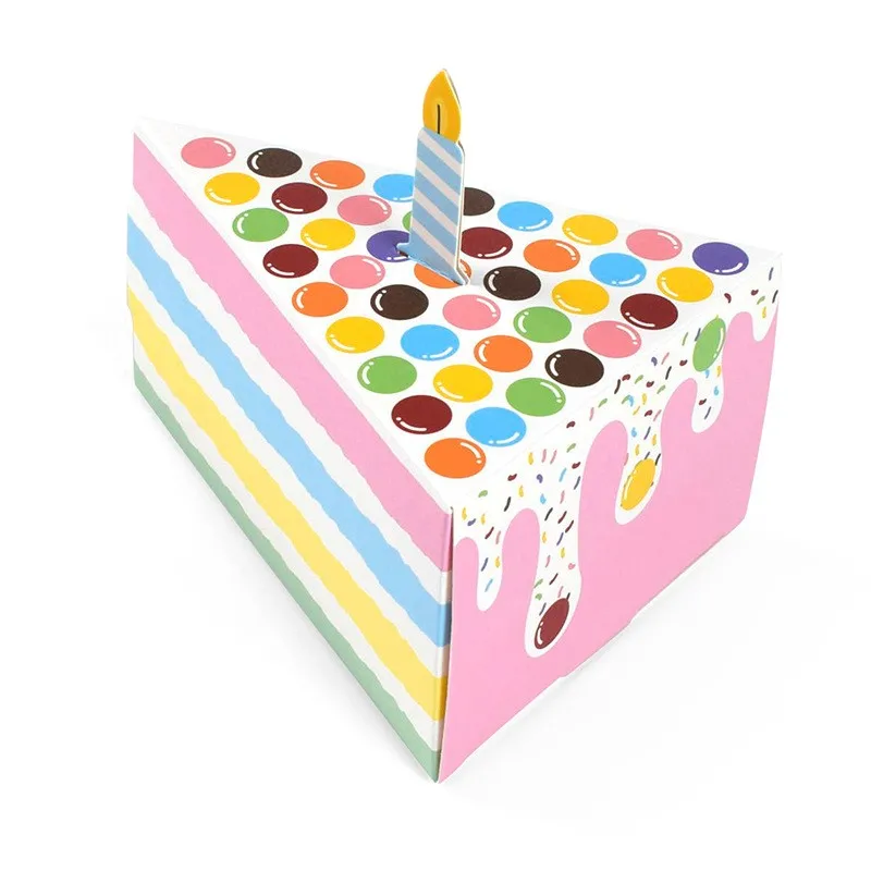 S touto barevnou dárkovou krabičkou na dort s praktickým víkem snadno vyřešíte problém, jak stylově zabalit dárek. Už nemusíte řešit nudné balení, zdlouhavé vázání mašlí nebo shánění krabičky na poslední chvíli. Dárková krabička na šperky nebo peníze v designu dortového dílku udělá každému radost a zároveň ochrání obsah.