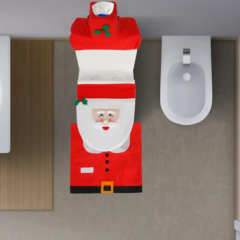Vánoční vzhled koupelny bez složitého zdobení vám pomůže vytvořit vánoční wc sada santa claus. Díky třem sladěným dílům nemusíte řešit prázdný a nevýrazný prostor ani hledat více doplňků zvlášť. Koupelnová sada dodá místnosti hravý styl, snadno se používá a potěší hned na první pohled.