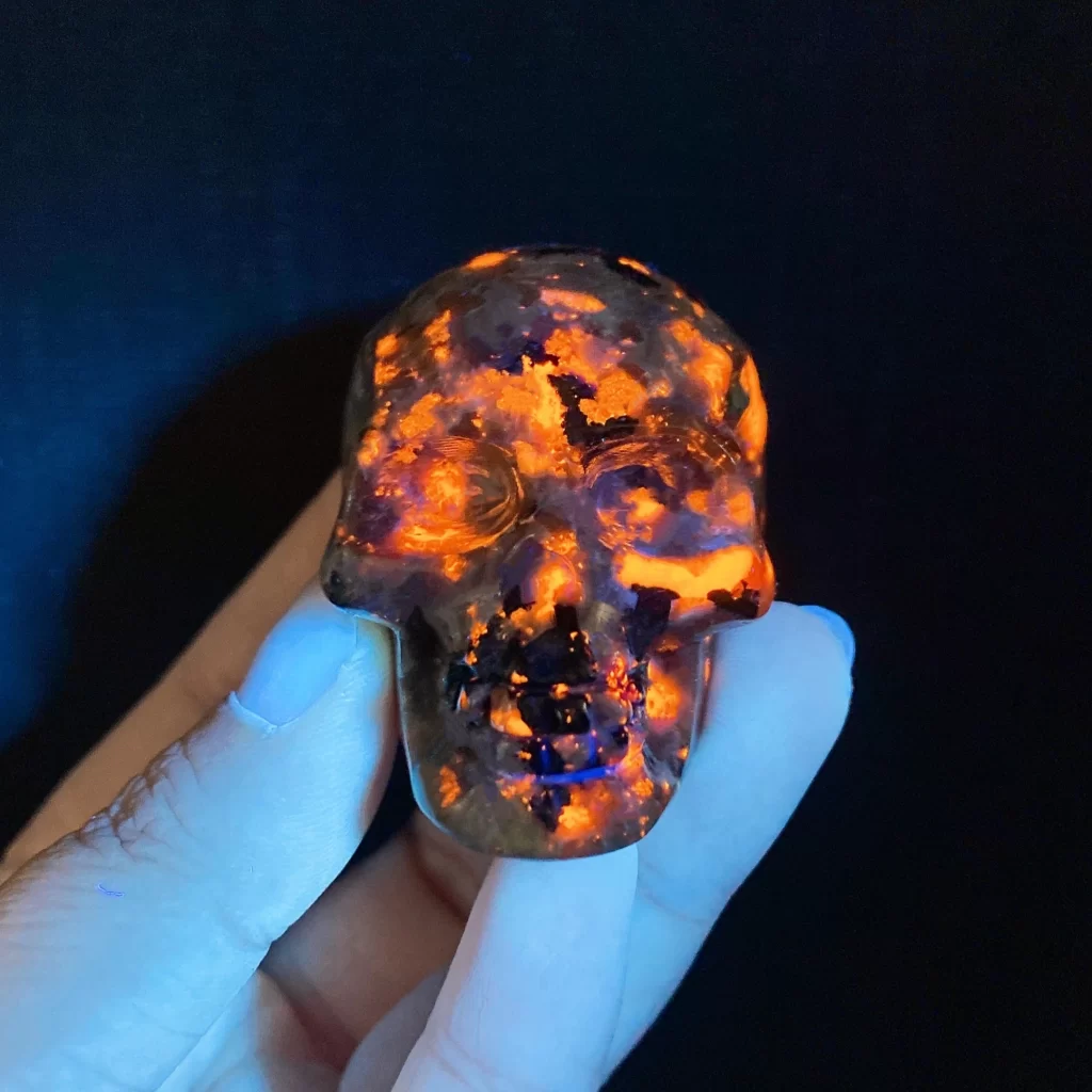 Tato lebka z yooperlitu je dokonalou volbou pro každého, kdo chce svůj domov ozvláštnit unikátními dekoracemi. Díky svému zářivému efektu pod UV světlem vytvoří úžasnou atmosféru a přitáhne pozornost každého návštěvníka. Už nikdy nebudete muset hledat jedinečné dárky – tato sběratelská figurka potěší každého milovníka minerálů a dekorací. Hladký povrch a ruční zpracování zajišťují kvalitu a jedinečnost každého kusu.