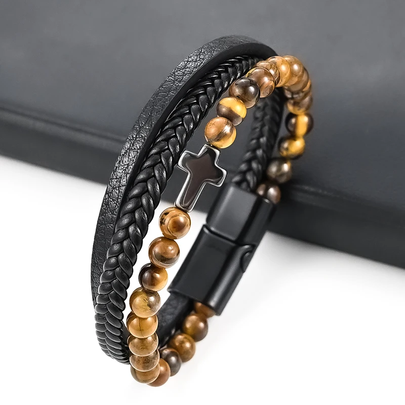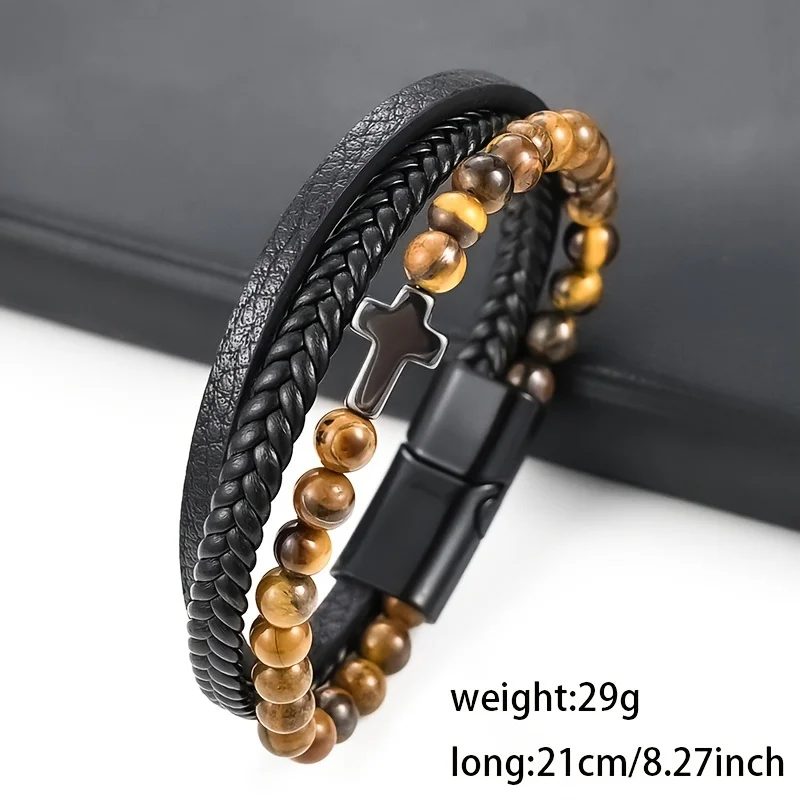 Vyřešíte nejistotu při výběru dárku, podtrhnete svůj styl a vyhnete se nudným doplňkům. Tento kožený náramek s korálky z tygřího oka a kovovým zdobením skvěle doplní každý pánský outfit. Díky vícestupňovému vrstvení získáte efekt, který přitáhne pozornost, ale zároveň zůstává elegantní.