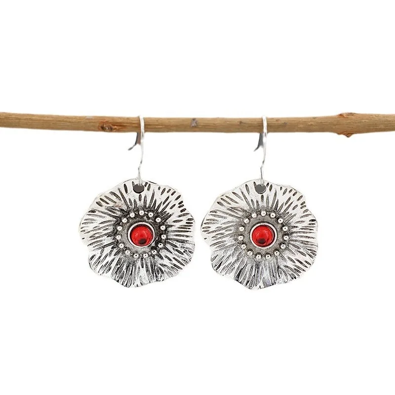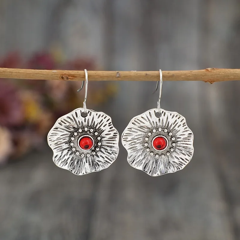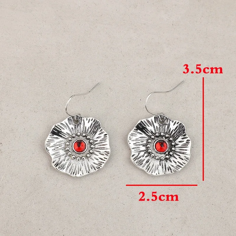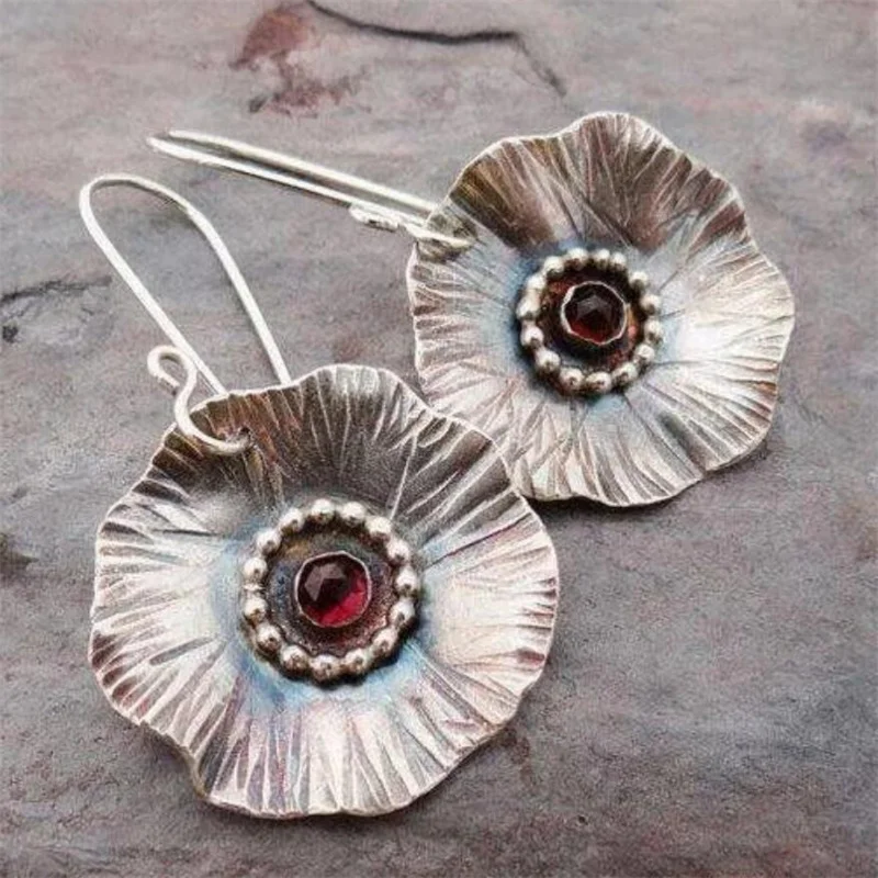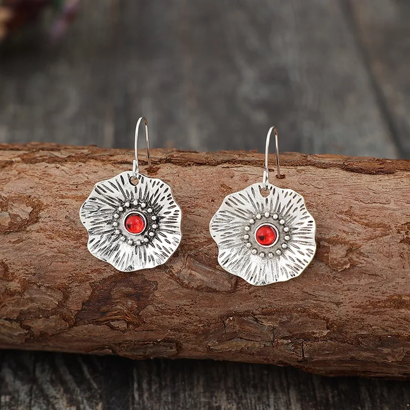 1 pár náušnic s květinovým vzorem a červeným kamenem
