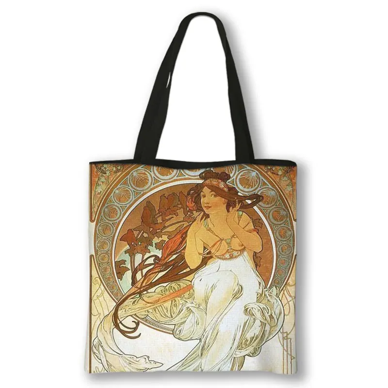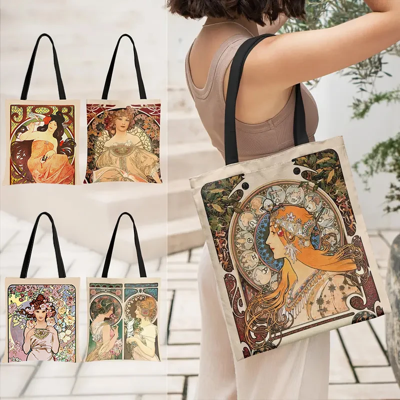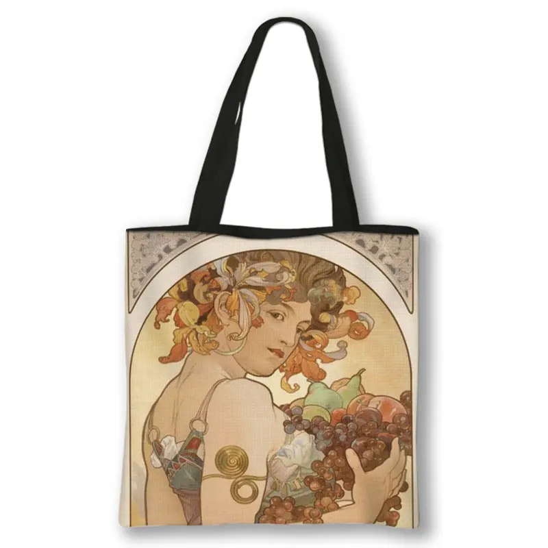 Elegantní plátěná taška s potiskem Alphonse Muchy vám pomůže vyniknout a přitom pohodlně přenést všechny každodenní nezbytnosti. Už žádné přecpané malé kabelky ani plastové tašky – díky této tašce přes rameno budete mít vše po ruce a stylově. Velká kapacita řeší problém přenášení věcí bez kompromisů a její opakovatelné použití je šetrné k přírodě.