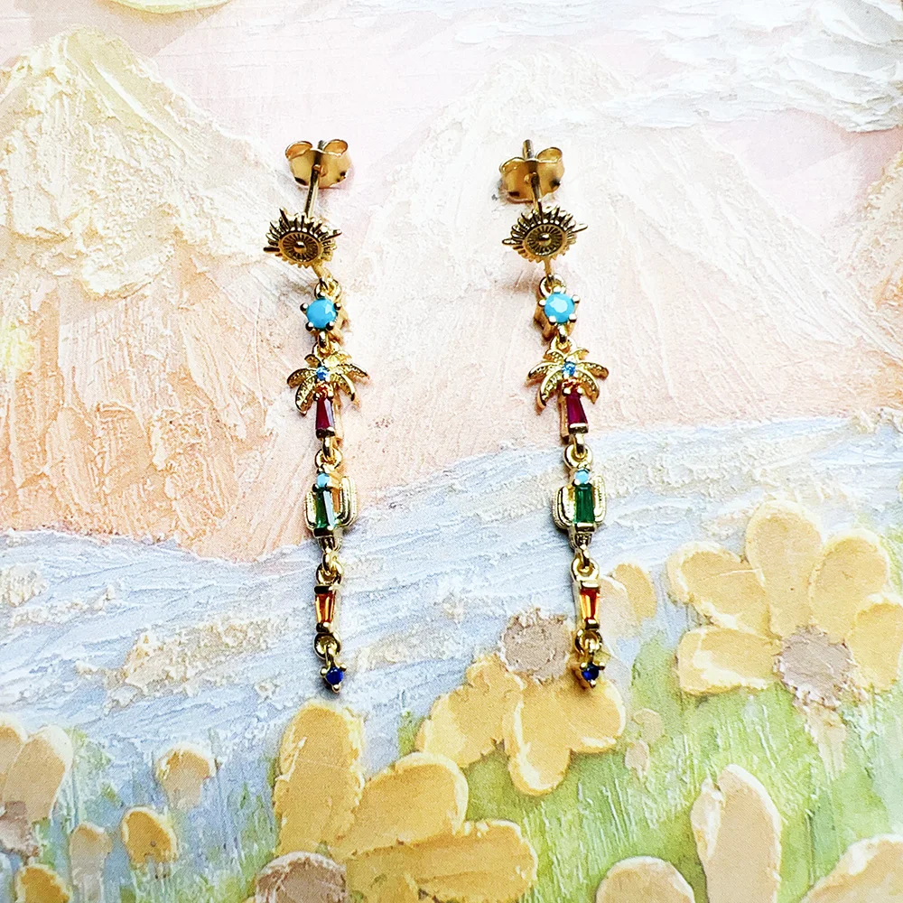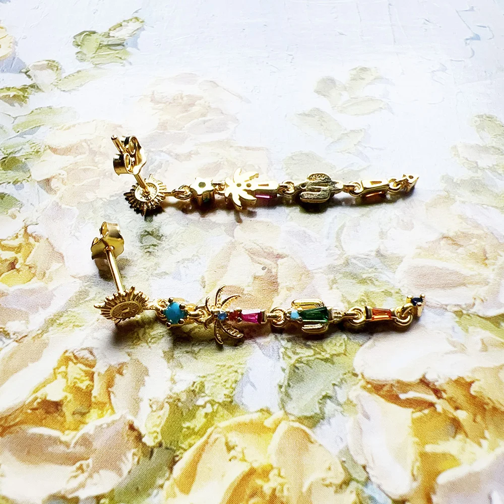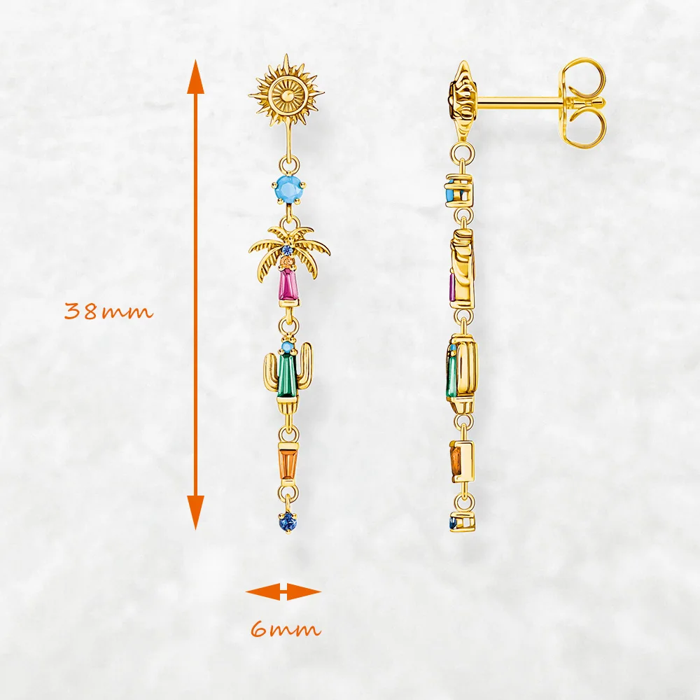Tyto pozlacené náušnice v boho stylu s motivem slunce a palmy dodají vašemu outfitu jedinečný šmrnc. Díky nim už nemusíte řešit nudné doplňky a obavy, zda se vám náušnice budou hodit k letnímu oblečení. Visací náušnice z kvalitního stříbra jsou odolné a navíc krásně podtrhnou vaši osobnost.