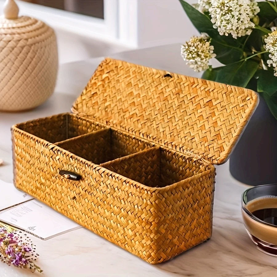 Tento proutěný úložný box s víkem pomůže udržet věci přehledně uspořádané a chráněné před prachem. Díky pevnému víku nemusíte řešit rozházenou kosmetiku ani drobnosti na stole. Elegantní vzhled z něj dělá dekorativní box, který zároveň funguje jako organizér kosmetiky pro každodenní použití.