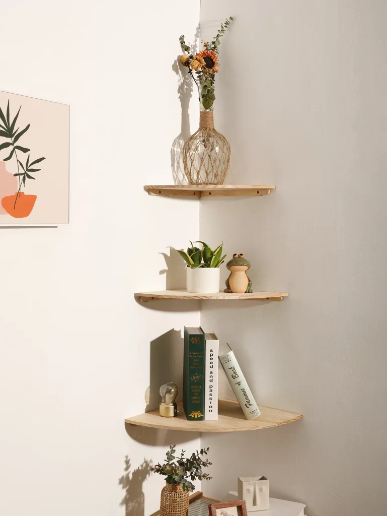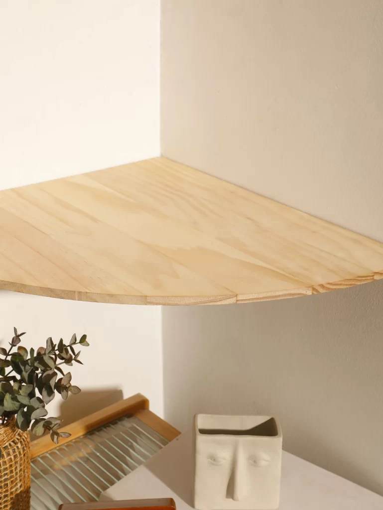 Tato rohová police chytře vyplní nevyužitý kout a vytvoří další prostor pro květiny, fotky i drobnosti. Díky konstrukci jako plovoucí police působí lehce a neruší vzhled místnosti. Dřevěná police pomůže vyřešit nedostatek úložného místa a zároveň uklidit přeplněné stolky a komody bez složité rekonstrukce.