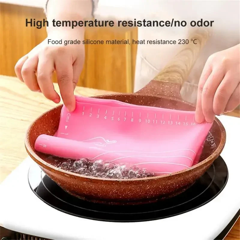 Tato silikonová podložka pomáhá mít válení těsta plně pod kontrolou bez lepení a klouzání. Díky měřítku snadno pohlídáte rozměr a podložka na pečení ochrání pracovní plochu před nečistotami. Nemusíte řešit zbytky těsta ani složité mytí, protože podložka na těsto se opláchne během chvilky a je hned připravená k dalšímu použití.