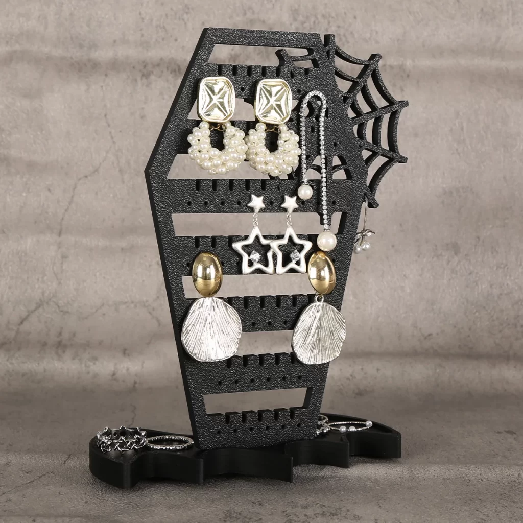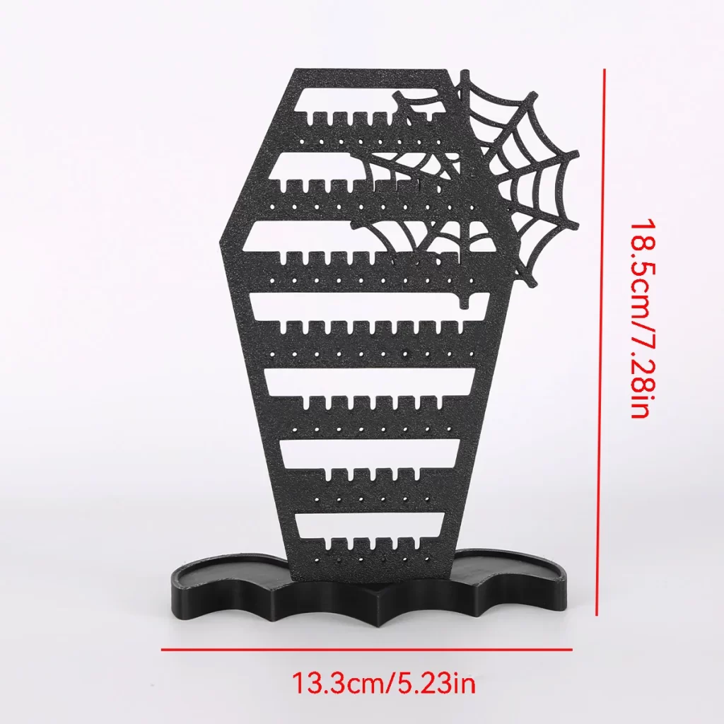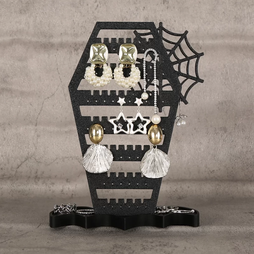 Už žádné zamotané páry a zdlouhavé hledání. Stojan na náušnice pomáhá udržet šperky přehledně na jednom místě a zároveň slouží jako výrazná halloween dekorace. Díky závěsnému provedení nemusíte řešit nepořádek v zásuvkách ani poškození náušnic a interiér získá originální atmosféru.