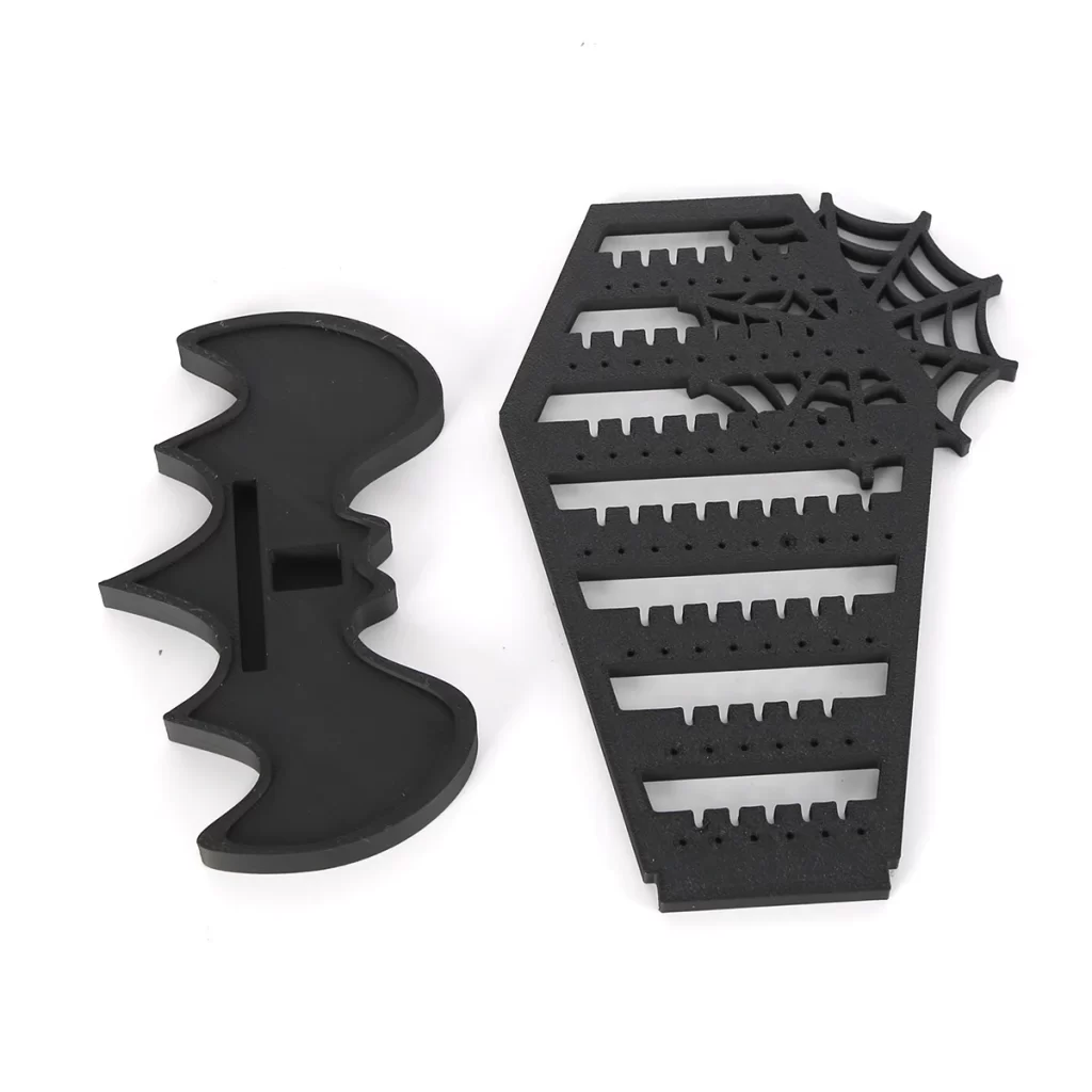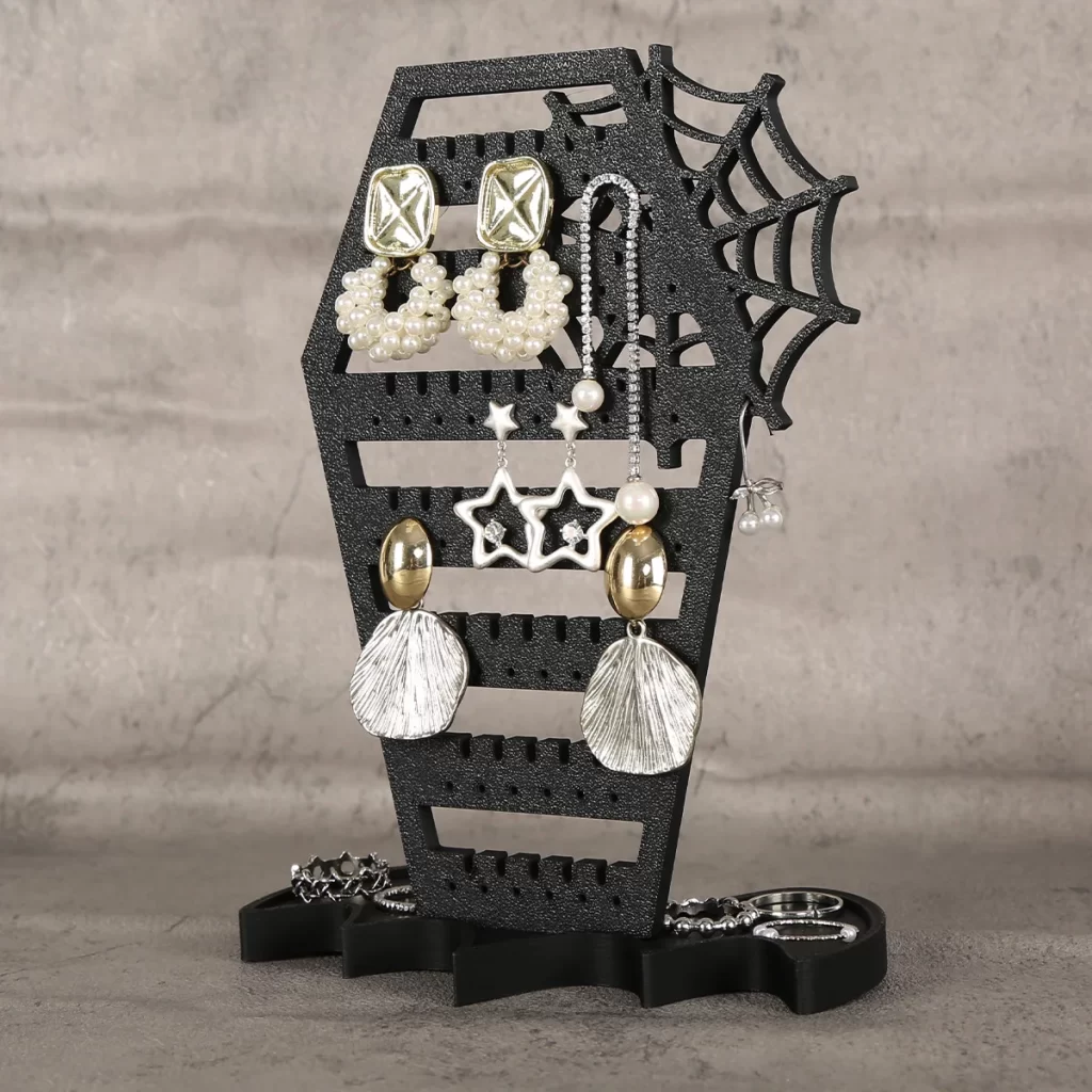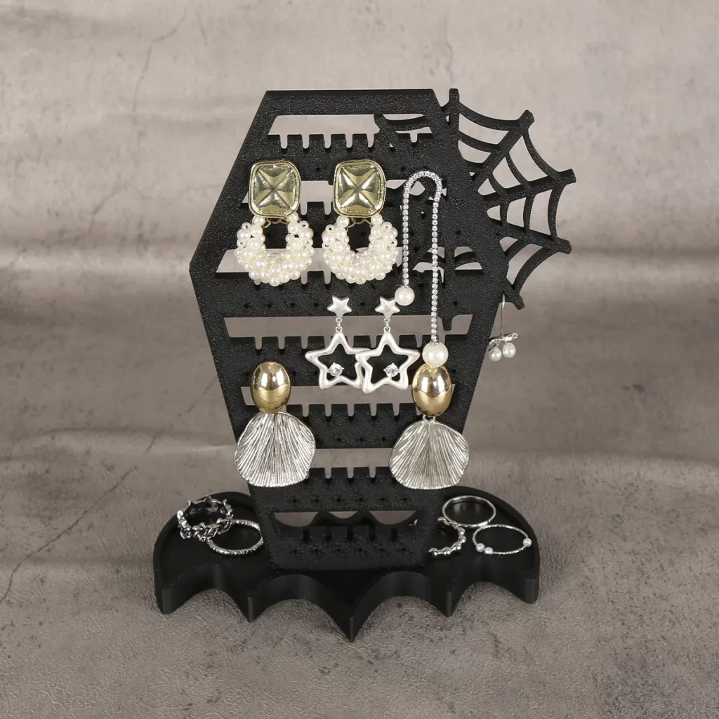 Už žádné zamotané páry a zdlouhavé hledání. Stojan na náušnice pomáhá udržet šperky přehledně na jednom místě a zároveň slouží jako výrazná halloween dekorace. Díky závěsnému provedení nemusíte řešit nepořádek v zásuvkách ani poškození náušnic a interiér získá originální atmosféru.