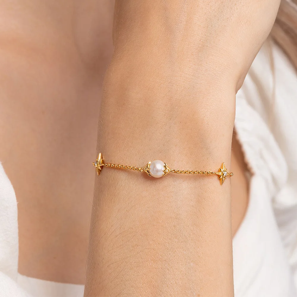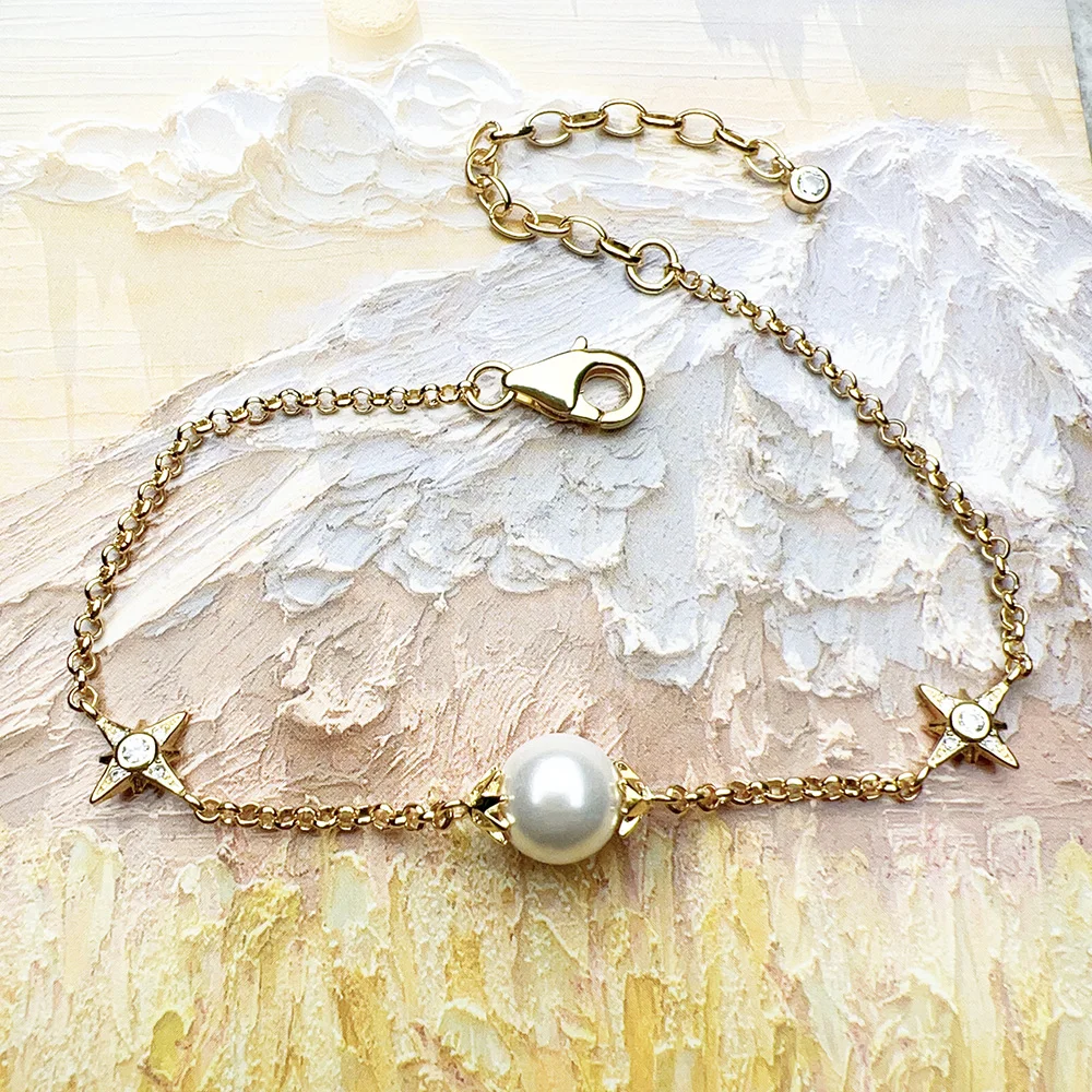 Elegantní stříbrný náramek s jemnou perlou a hvězdami přináší do vašeho outfitu nádech originality. Díky pozlacenému provedení odpadá starost s nevýraznými doplňky a místo toho získáte šperk, který dodá vašemu stylu jedinečnost. Řetízkový náramek je nastavitelný, takže nemusíte řešit problém s velikostí a vždy perfektně padne.