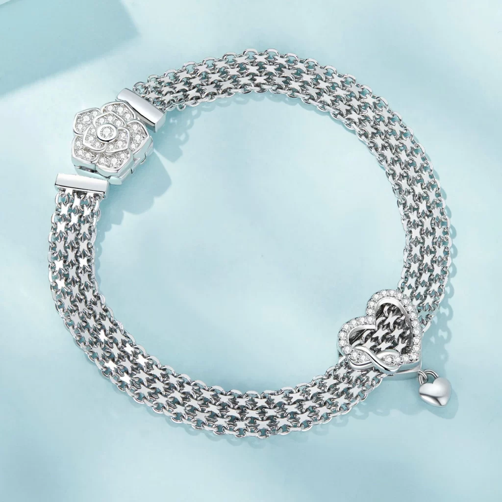 Stříbrný náramek růžový květ 925 vyřeší dilema, jak nosit elegantní šperk bez složitého ladění. Díky širokému řetízkovému provedení působí výrazně, ale stále jemně. Nemusíte řešit loupání barvy ani ztrátu lesku, protože stříbro 925 si drží svůj vzhled. Náramek je pohodlný, snadno kombinovatelný a vhodný pro každodenní i slavnostní chvíle.