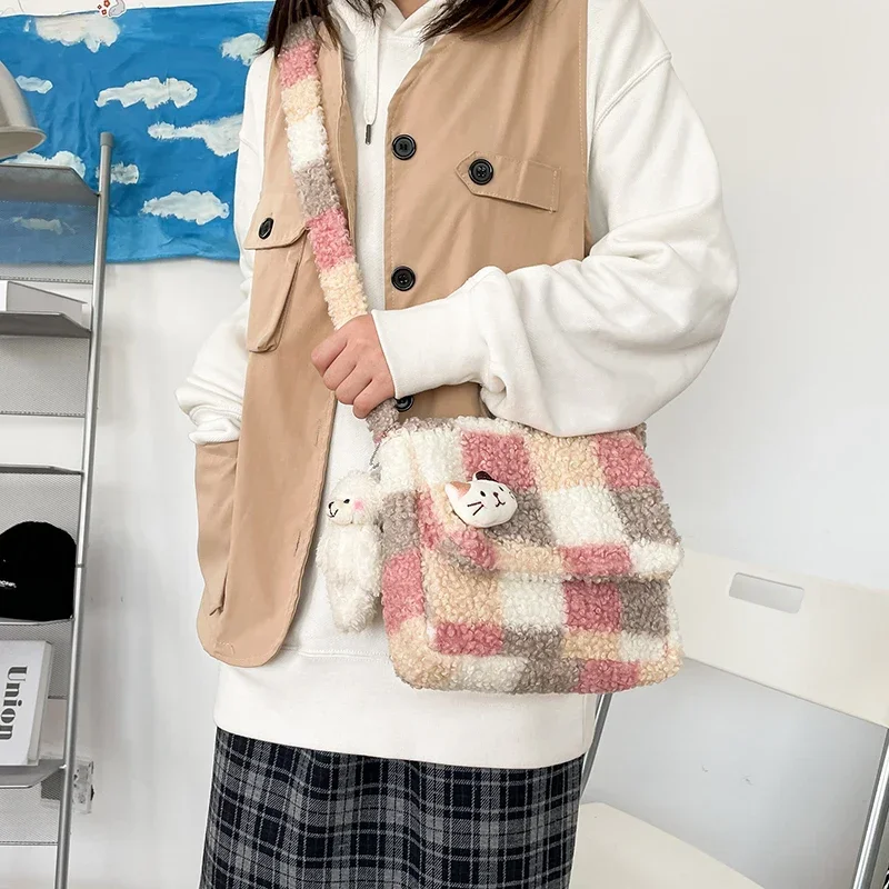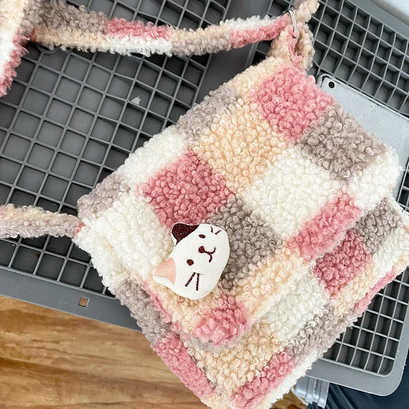 1× stylová chlupatá taška s kočkou s popruhem přes rameno