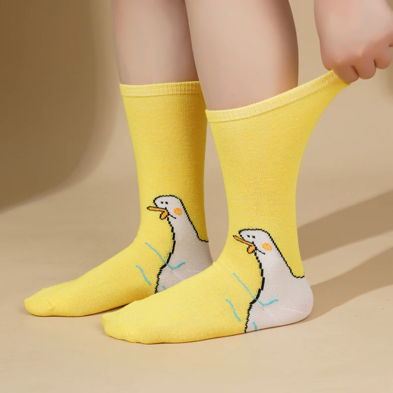 Zábavné ponožky s motivem kachny přinášejí radost a pohodlí do každodenního nošení. Díky příjemnému materiálu už neřešíte škrábání, svírání ani sklouzávání ponožek. Už žádné nudné ponožky v šuplíku – tyhle si zamilujete na první obutí! Jsou ideální na doma, do školy i jako vtipný dárek.
