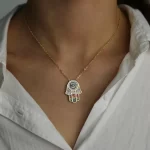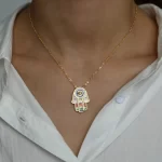 Tento náhrdelník s motivem hamsa ruky, známé také jako fatimina ruka, vám přinese elegantní vzhled a symbol ochrany. Díky němu se vyhnete shánění složitých doplňků, které by neseděly k vašemu stylu. Stylový design a smysl pro detail z něj dělají ideální šperk pro každodenní nošení i slavnostní příležitosti.